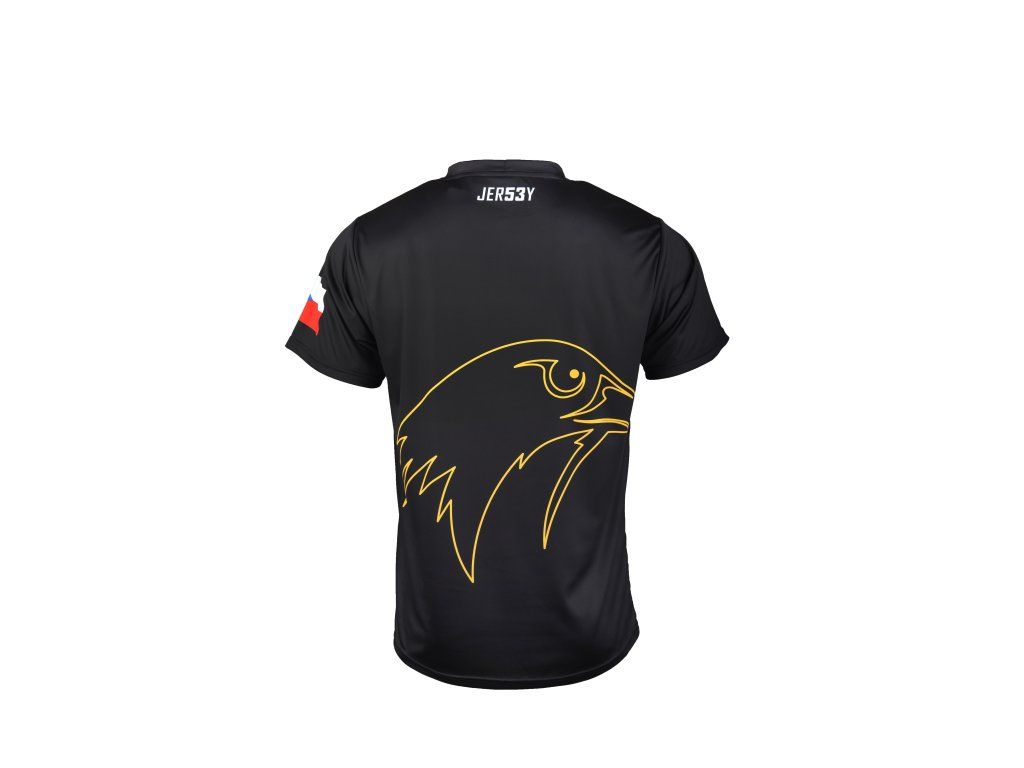 Zadní stranu zdobí velký, stylizovaný motiv hlavy sokola a dodává tak tričku výrazný charakter.